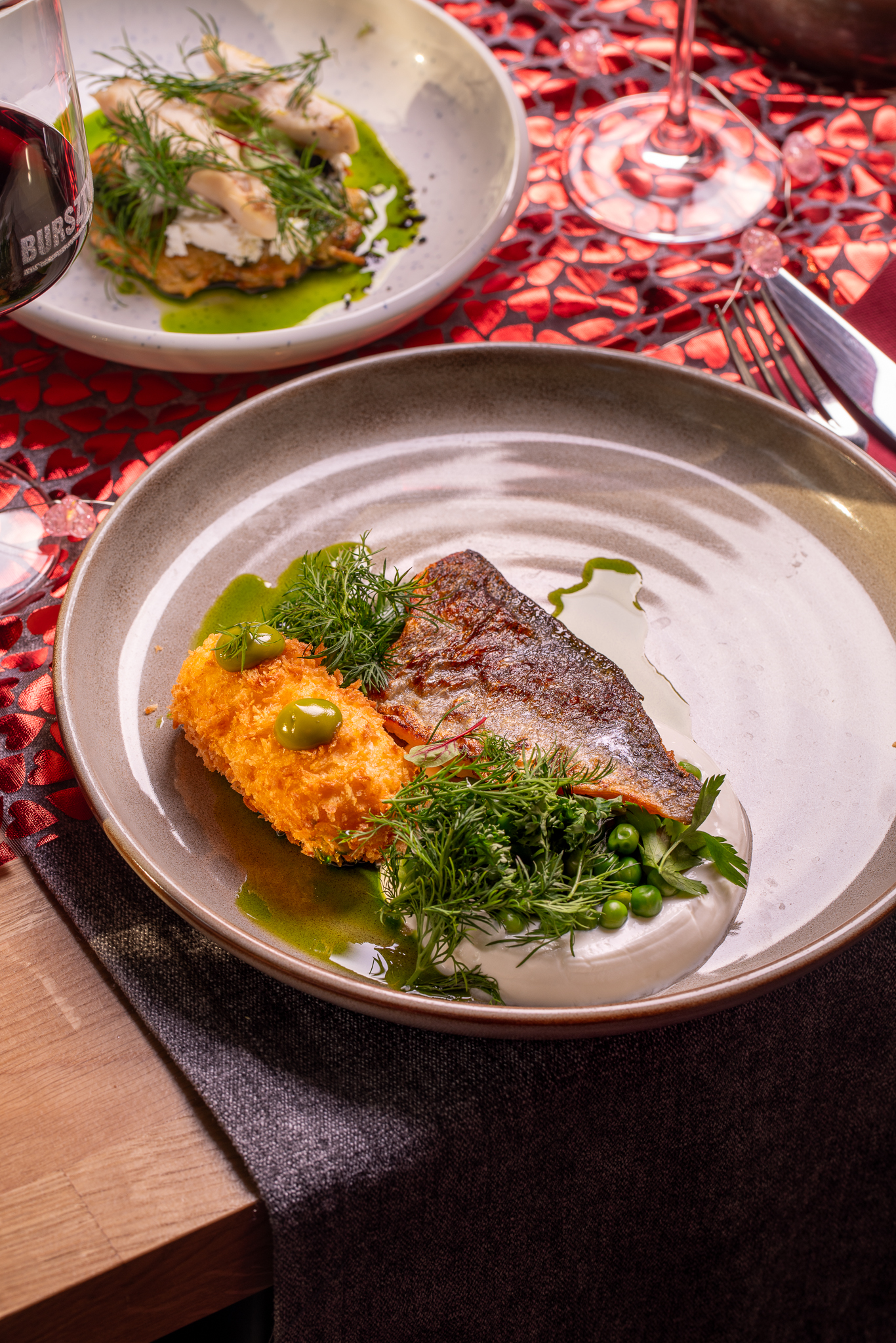 Filet z dorady na krokiecie ziemniaczano-porowo-szafranowym z majonezem koperkowym, labneh z zielonym groszkiem w cytrynowym maśle